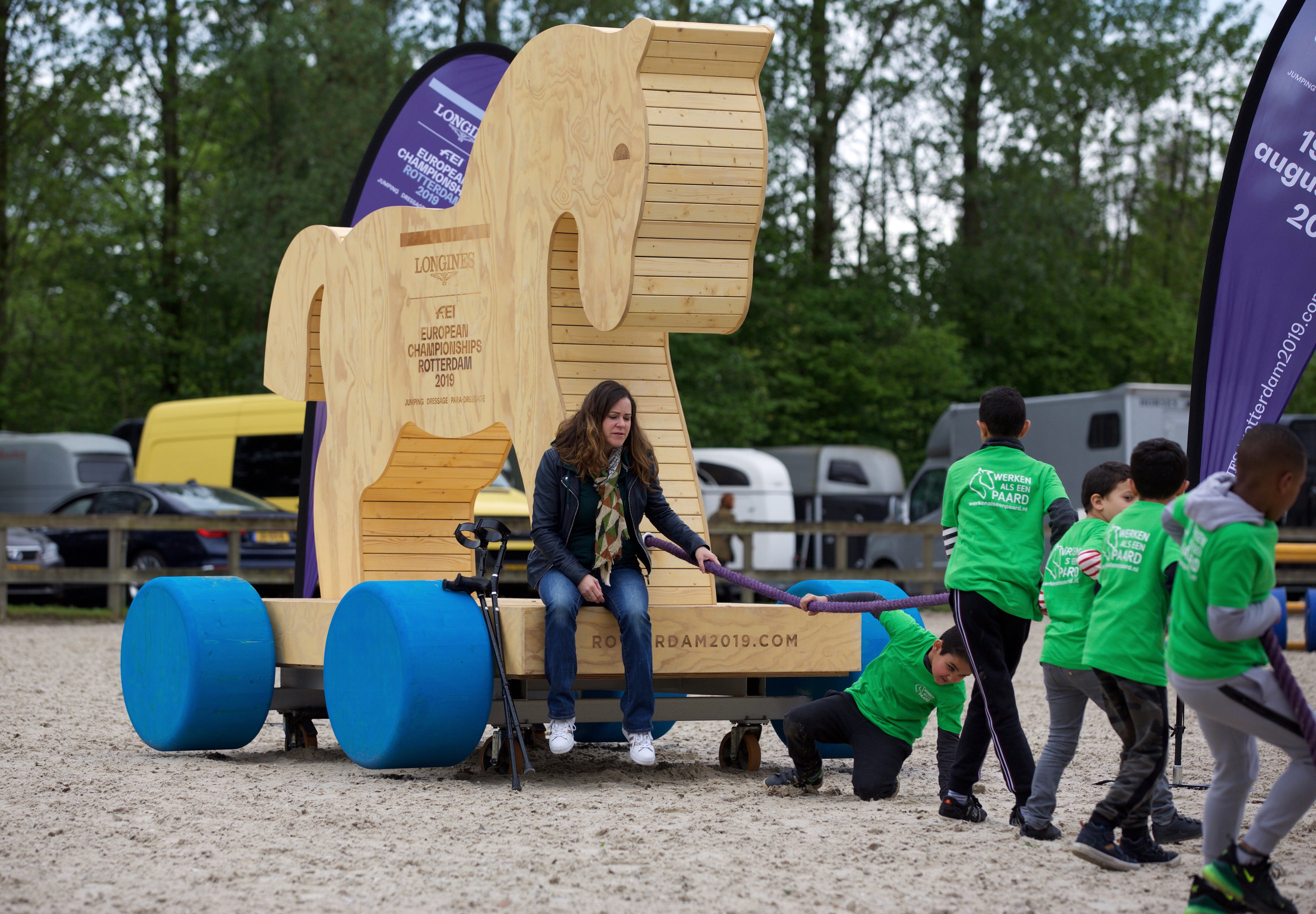 Tebbie te zien in Rotterdam Para-Dressuur amazone en paralympisch en wereldkampioen, Sanne Voets, maakte de typisch Rotterdamse naam van het iconische paard bekend. Het gigantische EK-paard (354kg en 2.90m hoog) gaat de komende maanden door de stad trekken. Voor de ‘pop-up’ events kunnen teams in verschillende categorieën zich vooraf inschrijven via de EK-website (vanaf 1 mei). Daarna vinden de eerste competities plaats met uiteindelijk een finale die voor de start van het EK zal plaatsvinden. Tebbie is tijdens de EK’s op het terrein van de EK’s te aanschouwen. Op deze locatie wordt geen competitie meer gehouden. Uiteraard kunnen bezoekers wel op de foto met het grootste paard van het EK. Meer dan 5000 kinderen aan het springen Van 6 mei t/m 14 juni gaat Sportbedrijf Rotterdam met het springparcours met als titel 'Jump, jump, everybody jump!' langs basisscholen groepen 5 t/m 8. De inschrijvingen zitten al helemaal vol. In totaal gaan ongeveer 5000 Rotterdamse schoolkinderen onder schooltijd deelnemen aan het parcours. De 40 kinderen die het parcours het snelste (èn foutloos) afleggen kunnen zich plaatsen voor 'The Final' die op 27 juni in Ahoy plaatsvindt. Buiten de sportlessen op school wordt het parcours ook nog ingezet bij verschillende evenementen. "In aanloop, tijdens en na de EK’s vinden er tal van side-events plaats." zegt Fred Rozendaal, algemeen directeur van de Longines FEI Europese Kampioenschappen Rotterdam 2019. "We willen verschillende doelgroepen kennis laten maken met de paardensport, kinderen stimuleren om te gaan sporten én laten zien hoe een topsportevenement als de Longines FEI Europese Kampioenschappen Springen, Dressuur en Para-Dressuur de verbinding legt op maatschappelijk vlak met de stad. Zo geven wij invulling aan het EK-thema Connected by Horsepower!" EK's komende maanden zichtbaar in Host City Rotterdam Rotterdam Festivals ontwikkelde samen met het oer-Rotterdamse Bureau Bunk het plan voor het iconische paard. "Het paard zal dit voorjaar en deze zomer op prominente plekken in Rotterdam zijn opwachting maken. Het paard zet aan tot team play; krachten bundelen en ‘m samen in beweging krijgen. Belangrijke elementen uit de EK’s die we op een laagdrempelige manier willen overbrengen op een zo breed mogelijk publiek" zegt Hedwig Hupkes van Rotterdam Festivals. “Daarbij zorgt Tebbie uiteraard voor prominente zichtbaarheid van de EK’s in de stad op een ludieke en speelse manier”. Een aantal side-events wordt mede georganiseerd door Rotterdam Topsport en het Sportbedrijf Rotterdam. "Deelnemen aan sport verhoogt de kwaliteit van het leven in de stad, stimuleert de persoonlijke ontwikkeling van mensen en vergroot de binding van bewoners. Dit sluit perfect aan bij het overkoepelende thema van de EK’s: ‘Connected by Horsepower’. Met het parcours willen we zoveel mogelijk kinderen activeren en laten bewegen." aldus Edwin de Koning, project manager grote sportevenementen bij Sportbedrijf Rotterdam. "Tebbie kom je straks overal tegen. We hopen dat veel Rotterdammers met elkaar een team vormen en als team Tebbie zo snel mogelijk 50 meter verplaatsen. En dat die teams natuurlijk gaan strijden voor een plekje in de halve finales tijdens de kwalificaties op zaterdag 18 mei (parkeerplaats Ahoy Rotterdam) en zondag 30 juni (parkeerplaats Topsportcentrum)." "Binnen de hippische wereld leven de komende EK's al enorm. Alle Europese topruiters en -amazones hebben Rotterdam al prominent in hun agenda's staan," zegt Hans den Oudendammer, directeur Rotterdam Topsport. "Het is leuk om te zien dat door dit activatie programma, dit grootste internationale paardensportevenement ook voor alle Rotterdammers alom zichtbaar wordt. Iedereen weet straks dat de EK's eraan komen!" Werken als een Paard Vakantieschool Vanwege de EK's die dit jaar in de schoolvakantie (van 19 t/m 25 augustus) plaatsvinden, is het programma van de Vakantieschool van Werken als een Paard naar de meivakantie verschoven. De leerlingen van Basisschool Christophoor, Crisisopvang Maatschappelijk centrum Rotterdam e.o., Basisschool OBS Pantarijn, Basisschool Sterrenschool de Globbetrotter, Crisisopvang Stichting Arosa en Speciaal onderwijs Horizon krijgen een leuke, leerzame en kosteloze vakantiedag aangeboden. Met als belangrijkste boodschap: "Als je werkt als een paard kun je veel bereiken." Het programma wordt op iedere specifieke doelgroep afgestemd, maar op hoofdlijnen is het nagenoeg hetzelfde. ’s Morgens theorieles over paarden en sociaal emotionele vaardigheden, daarna een gezamenlijke lunch en verschillende activiteiten waaronder: deelname aan het EK-parcours, samenwerking-spellen, paardentaarten maken, paarden verzorgen / poetsen en ponyrijden. Als afsluiting krijgen de kinderen een Werken als een Paard shirt en een medaille. photo credits: Danielle Vink